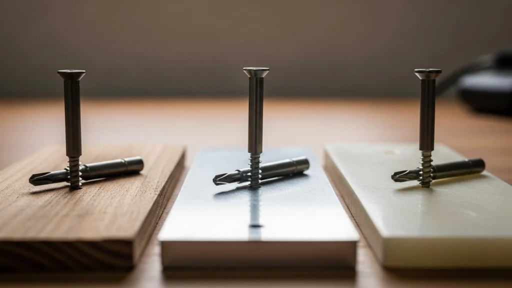 Madeira macia aceita parafusos com mais facilidade, mas também pode rachar se o aperto for excessivo. Plásticos exigem cuidado para não deformar a rosca.