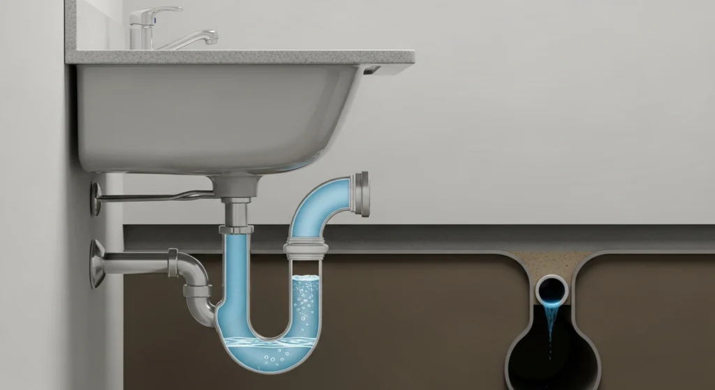 Entre a pia e o esgoto, existe uma barreira simples: um trecho que mantém água parada após o uso. Essa “água guardada” funciona como selo, dificultando que gases do esgoto voltem para o ambiente.