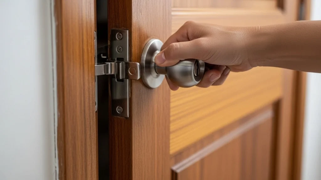 A imagem mostra o momento exato em que a porta encontra resistência antes de fechar completamente. Ela ajuda a visualizar que a “batida” não é força excessiva, mas um desalinhamento entre a lingueta e o encaixe, que gera tranco, barulho e necessidade de empurrar a porta.