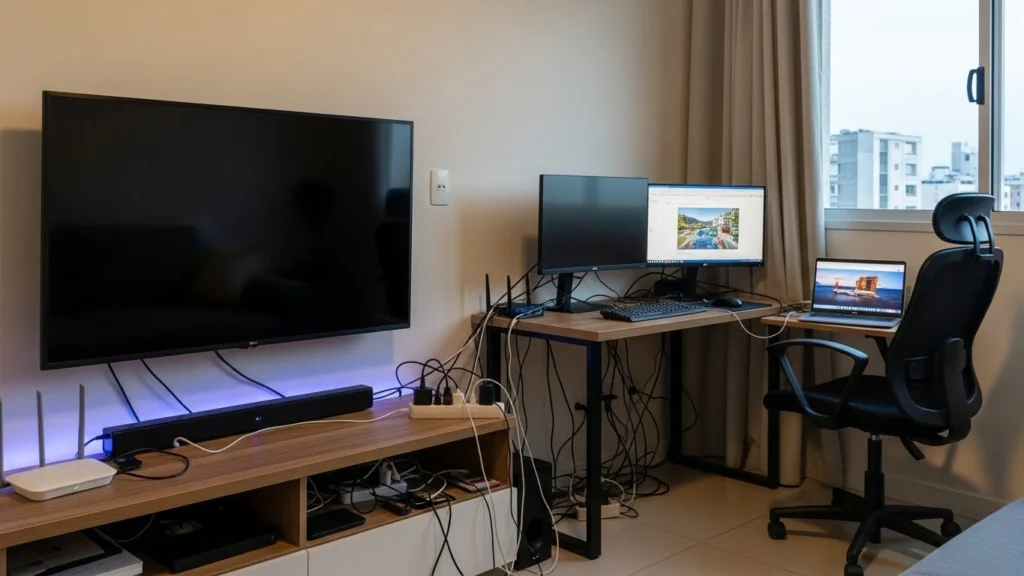 Segundo, agrupe por função. Um exemplo realista: deixe TV, soundbar e console juntos em uma régua de boa qualidade, e coloque carregadores em outro ponto, evitando somar tudo no mesmo adaptador.