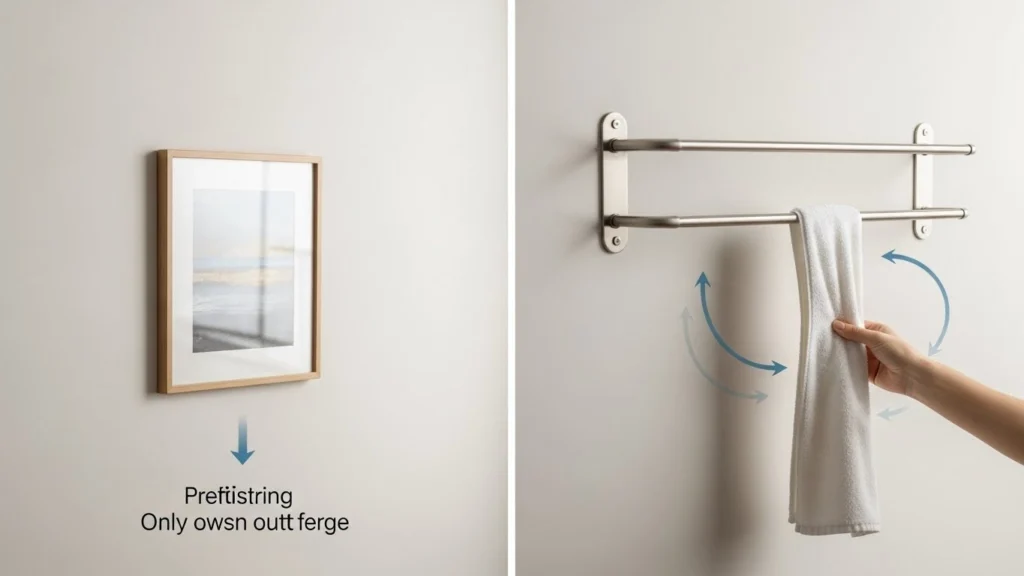 O mesmo objeto pode exigir buchas diferentes dependendo de como ele é usado. Um quadro pesado costuma ficar parado, enquanto um porta-toalha leve sofre puxões repetidos, que multiplicam a força na fixação.