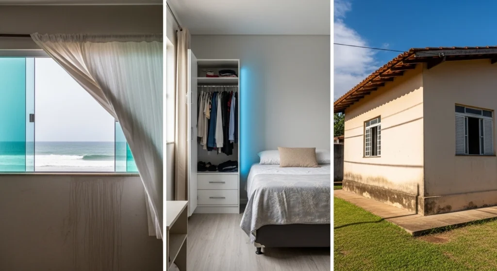 Em cidades litorâneas, o ar úmido e a menor incidência de sol em certos períodos favorecem manchas em quartos e paredes que pegam vento do mar. Ventilação diária e afastar móveis tende a fazer mais diferença do que “produto milagroso”.
