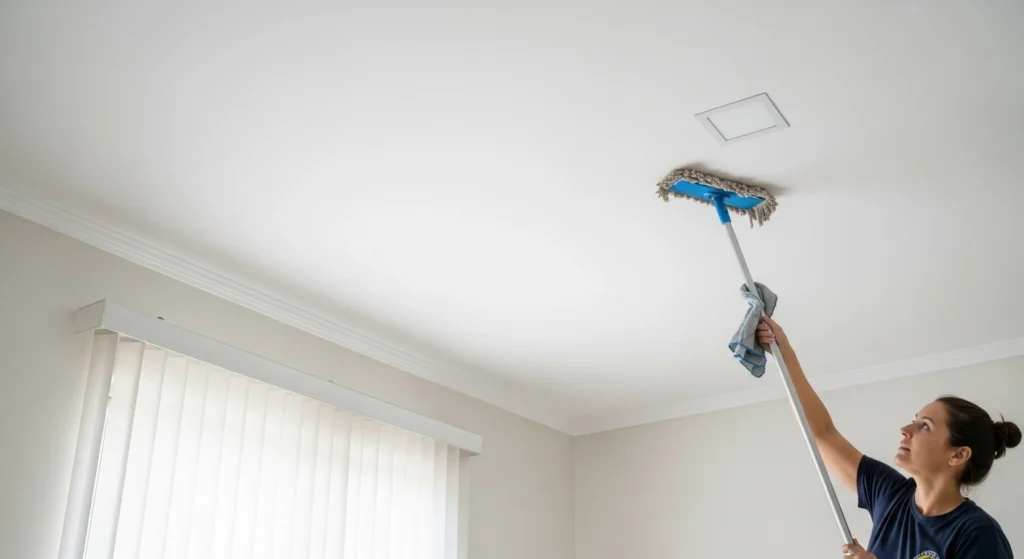 A imagem representa a manutenção correta do teto após a pintura, com limpeza leve e cuidadosa. O uso de pano seco ou apenas levemente umedecido evita desgaste da tinta e preserva a uniformidade do acabamento. A iluminação suave reforça a ideia de conservação ao longo do tempo, mostrando como pequenas ações rotineiras ajudam o teto a permanecer bonito e sem marcas.
