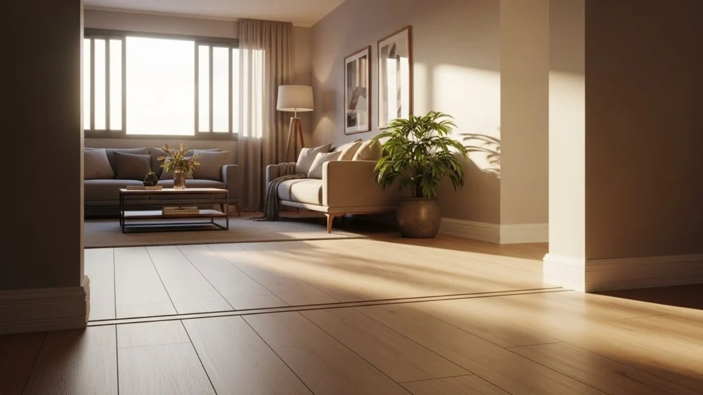 Se você tiver uma soleira de transição, olhe a borda: em piso flutuante, costuma existir um perfil e uma folga escondida; em piso colado, a borda é rígida e “presa” ao contrapiso.