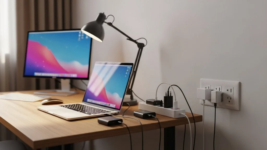 Um espaço de estudos moderno costuma reunir notebook, monitor externo, luminária, carregadores e, às vezes, impressora. Cada item isolado parece inofensivo, mas o conjunto pode exigir mais do circuito do que ele foi projetado para suportar.