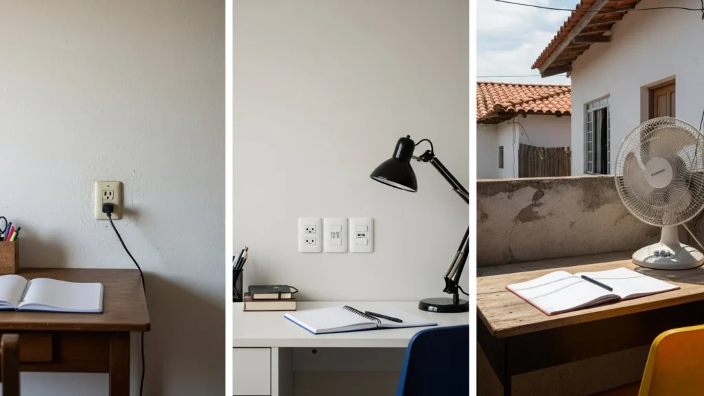 A imagem compara como o mesmo canto de estudos se comporta em contextos diferentes. Em casas, a instalação pode variar conforme a idade da construção; em apartamentos, os circuitos costumam ser mais padronizados; já em algumas regiões, o uso de ventiladores ou outros apoios térmicos aumenta a carga elétrica, exigindo adaptação no uso diário.