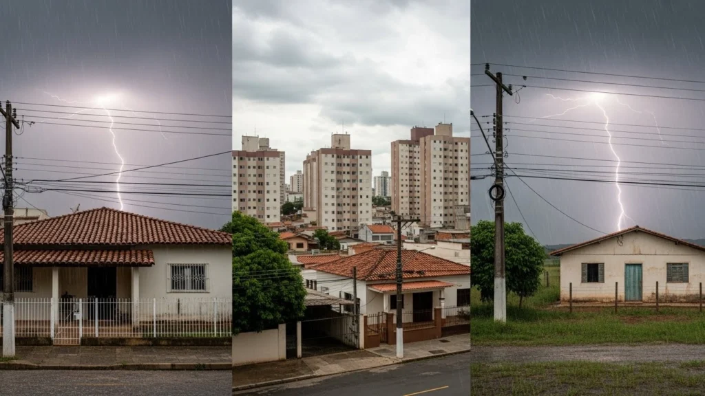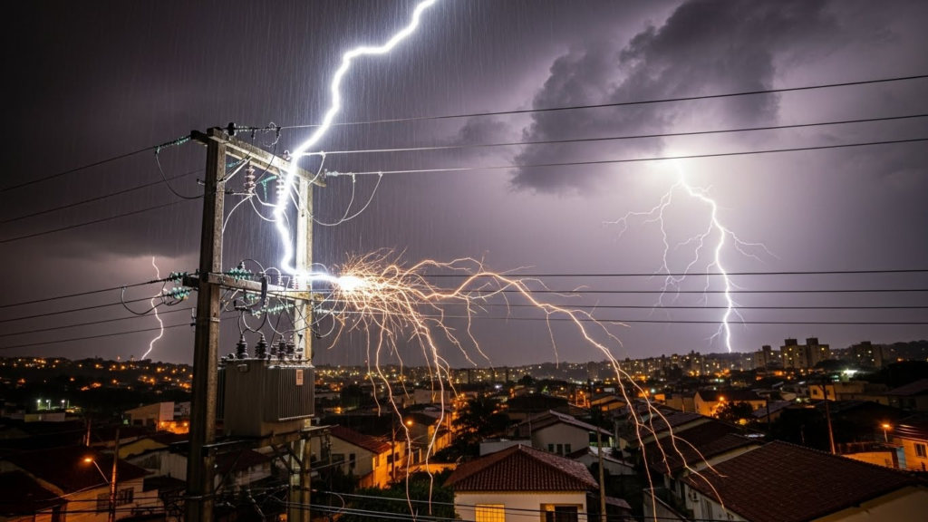 O raio não precisa atingir sua casa para causar danos. Quando ele cai na rede pública ou em áreas próximas, gera um surto de energia que percorre cabos e aterramentos.