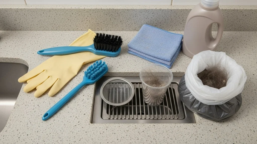 4) Remova o que está visível. Use luvas, retire grelha e limpe cabelo e sujeira do copo do ralo/caixa sifonada, sem empurrar resíduos para dentro. Coloque o resíduo em saco e descarte no lixo.