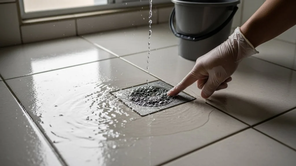 A imagem mostra um ralo que não consegue escoar no ritmo normal: a água fica represada no box e começa a subir de volta, formando uma poça com pequenas bolhas. O balde e a mão com luva reforçam a ideia de teste cuidadoso e observação do retorno, típico quando há passagem parcialmente bloqueada na tubulação.
