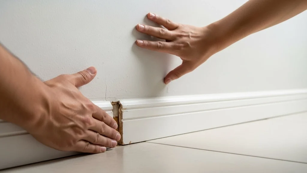 Impactos repetidos também contam: aspirador batendo sempre no mesmo trecho, brinquedo encostando, rodo pressionando em área molhada. O sinal típico é a peça soltar primeiro nas pontas, com uma “barriga” no meio, como se tivesse perdido aderência.