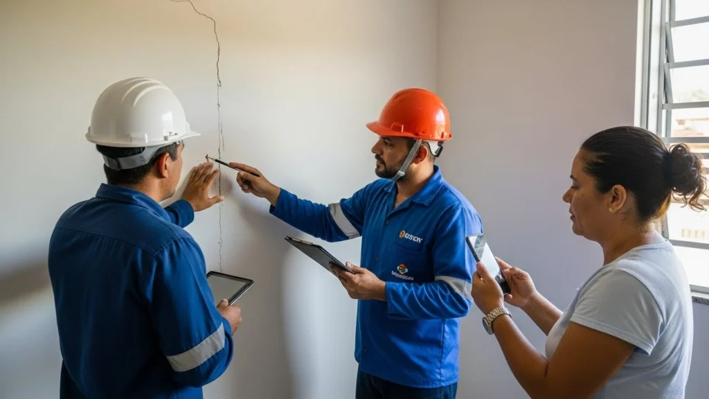 A imagem representa o momento de avaliação técnica, em que um profissional analisa a parede junto ao morador, observa a trinca, consulta registros e explica as possíveis causas, ajudando a esclarecer se é apenas um ajuste de acabamento ou algo que exige acompanhamento especializado.