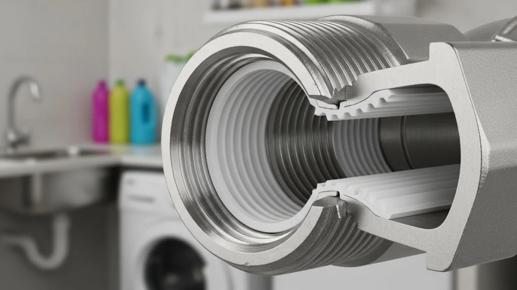 A imagem mostra a fita acomodada entre os filetes da rosca, preenchendo pequenas irregularidades que poderiam virar caminho para a água. Ela não “cola” as peças nem corrige defeitos, mas ajuda a vedar microfolgas quando a rosca está íntegra e bem alinhada. O detalhe em corte deixa claro que a vedação acontece pelo contato uniforme e pela compressão correta durante o aperto.