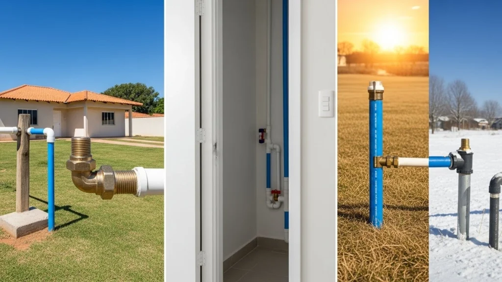 A imagem compara como o mesmo tipo de conexão roscada aparece em contextos diferentes no Brasil. Em casas, o acesso costuma ser mais fácil e muitas conexões ficam aparentes, facilitando inspeção e correção. Em apartamentos, as instalações ficam concentradas em shafts e paredes, o que exige mais cuidado, pois vazamentos tendem a ficar ocultos. Já a variação regional mostra como calor e frio influenciam dilatação e pressão, aumentando a importância de uma vedação bem executada desde a montagem.