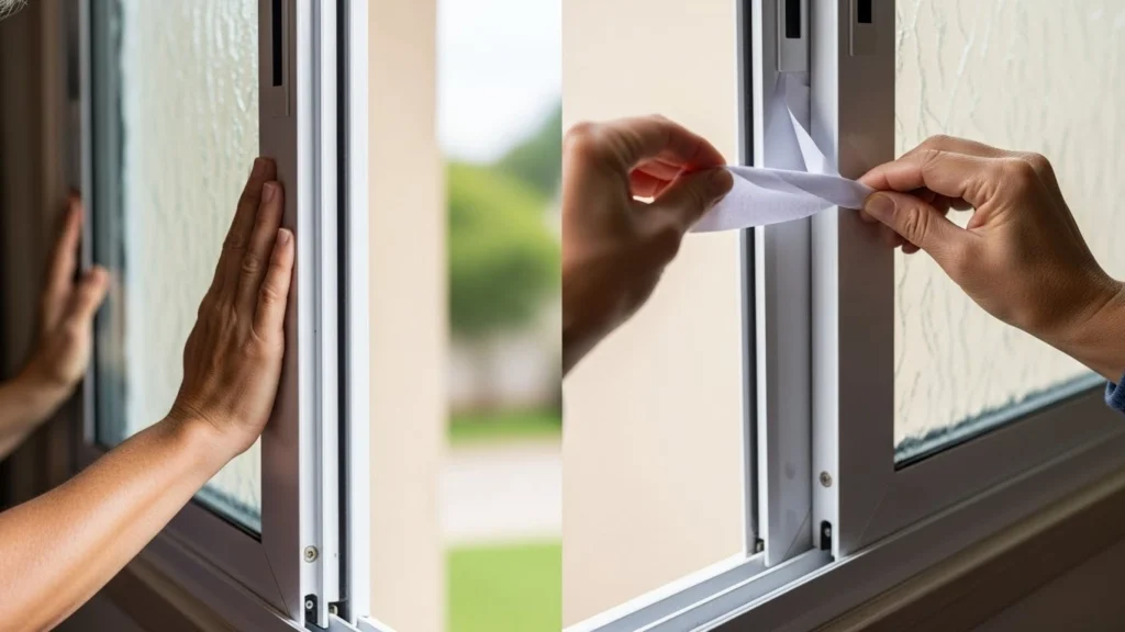 Se o ar é sentido mesmo com a folha pressionada contra o batente, desconfie do perímetro do marco. O teste com lanterna perto das laterais ajuda a separar os pontos.